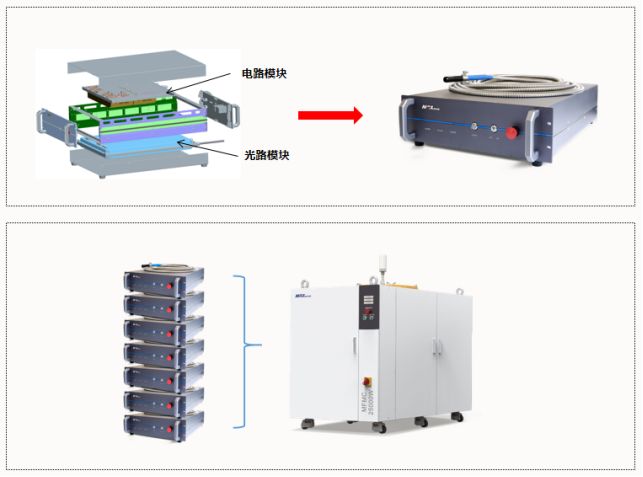 全光纤被动合成技术通过对多束大功率光纤激光器的合束,实现万瓦级激光功率输出,整套方案具有结构紧凑、合束效率高、稳定可靠性等优点。这种合成方式使用多个激光模组进行扩展、模块化设计可扩展性强、整机系统稳定性高,易于工程化,这也是创鑫激光超高功率光纤激光器所使用的技术方案。