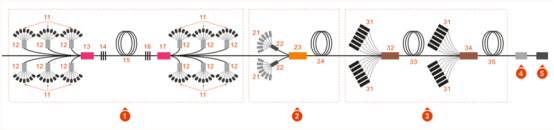 基于同带泵浦技术的单纤万瓦级全光纤激光器系统的主要工作原理是三级或多级放大,由主振荡器(种子源),半导体激光泵浦下的光纤放大器,同带泵浦光纤放大器和泵浦滤除器依次相连并由QBH输出光纤激光。整套系统理论上易于实现,但在实际操作中放大级数越多,对光纤所承受的激光密度要求越高,有例如光路系统复杂、非线性效应明显、可扩展性差、功率输出有限等风险。